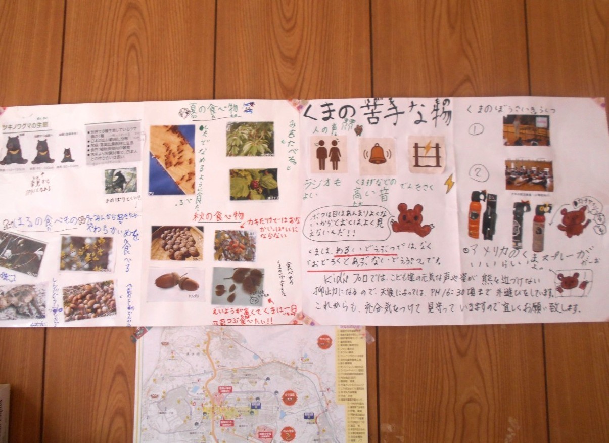 同時に、職員が受けた「クマ対策研修」の内容をおこさんたちにもシェアしました。クマについて知るための【クマ新聞】はみんなで協力し作成しました☆