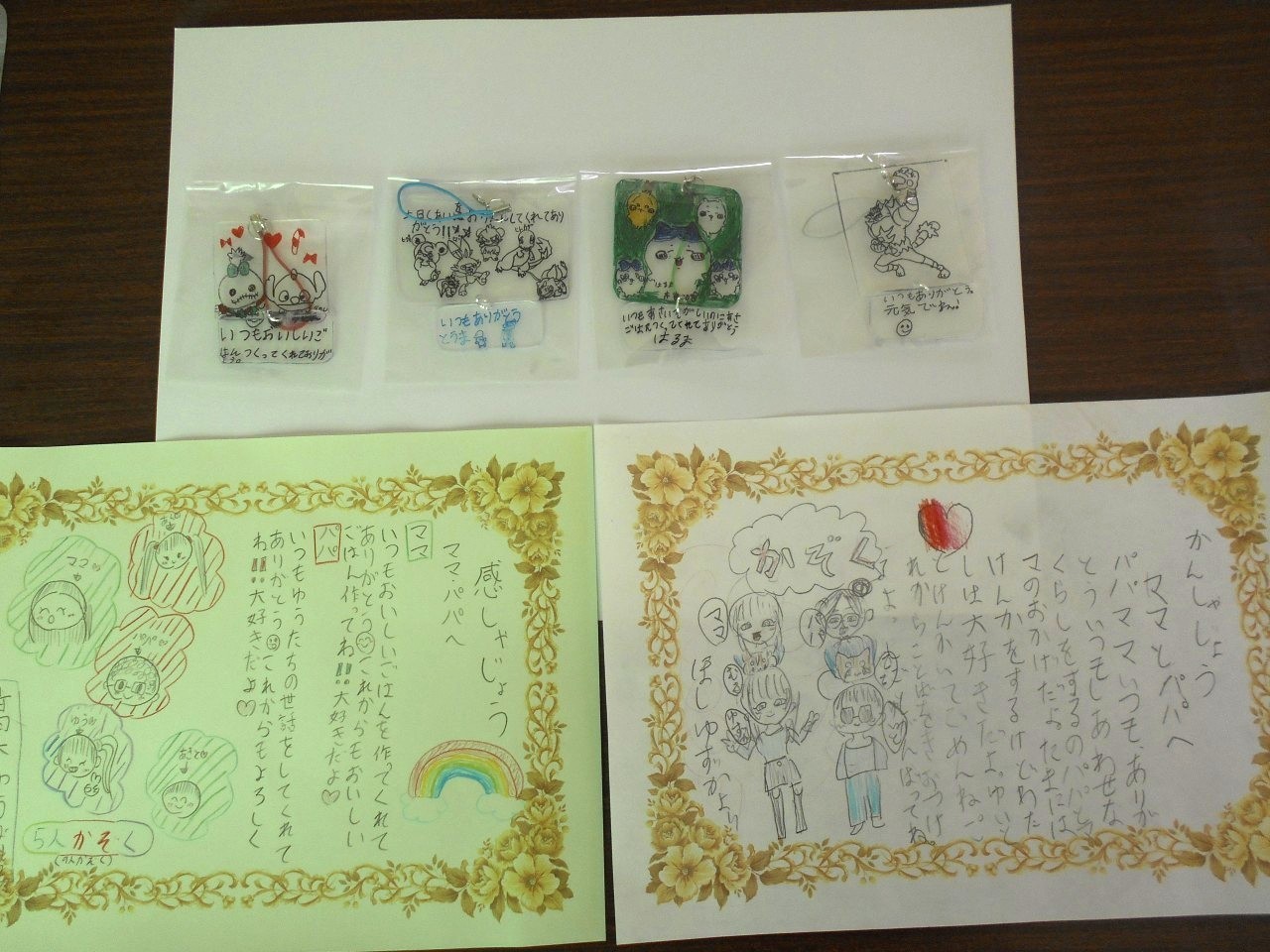 勤労感謝の日プレゼントは、いつもありがとうの気持ちを込めて書いた感謝状と、みんな得意な「プラバンキーホルダー」を作成しました。普段はなかなか言えない「ありがとう」の気持ちが詰まっていました☆