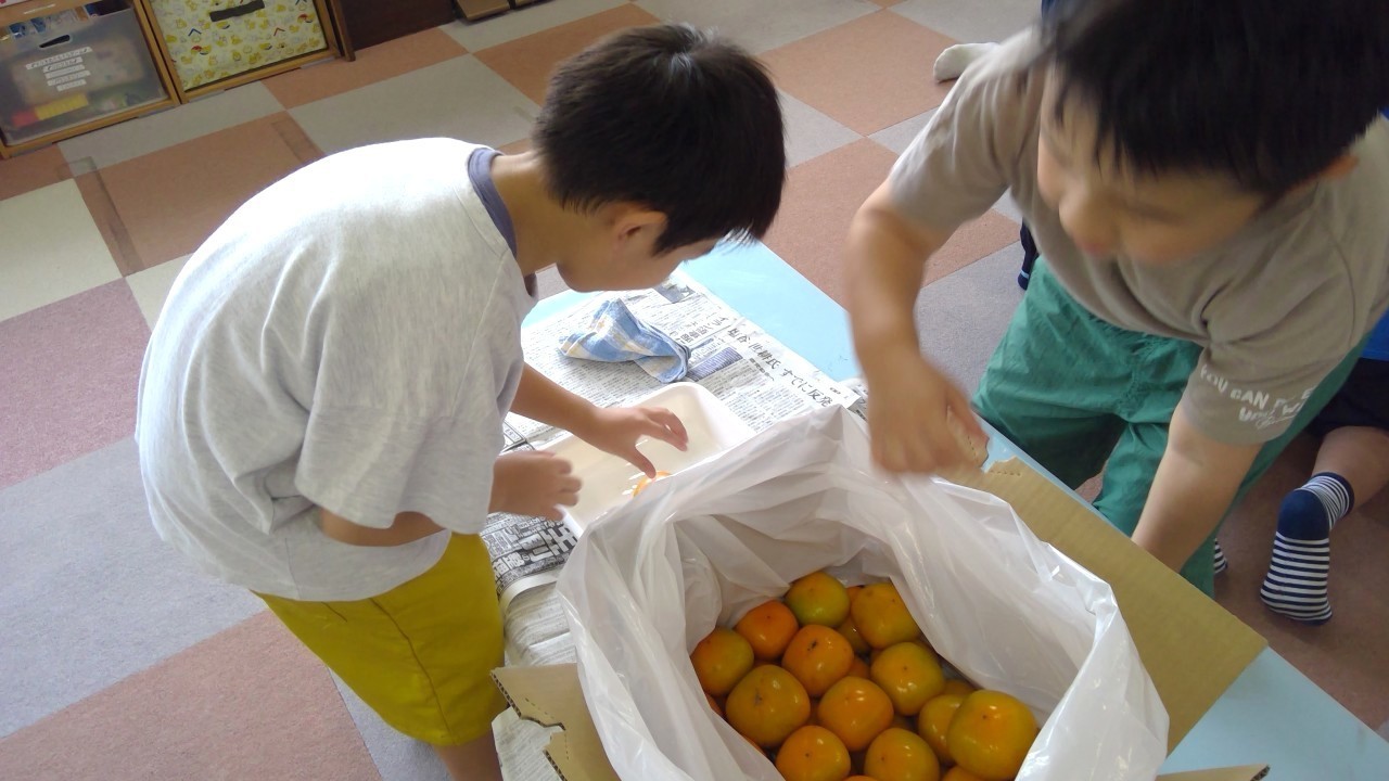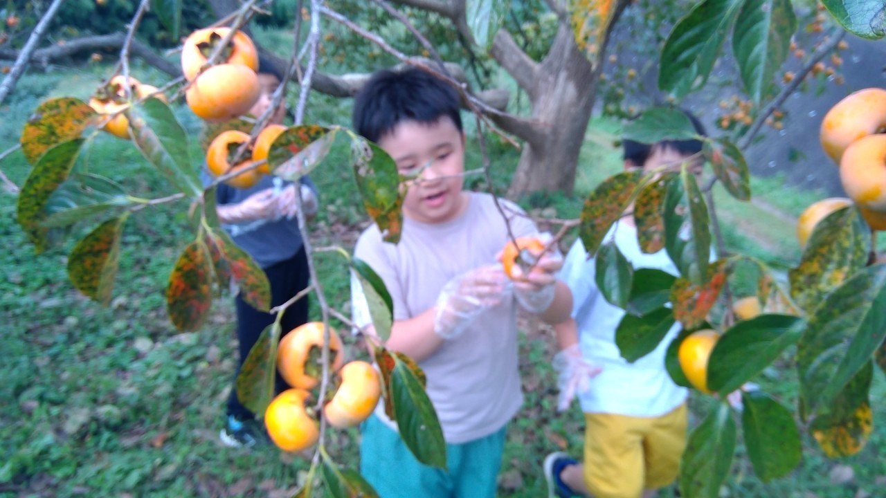 学童の隣にある柿木は、いつもこども達の木登りの木になっていますが、この季節はたくさんの実をつけます。今年は柿の渋抜きをしてみました。