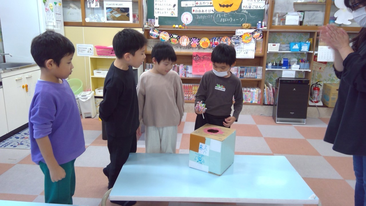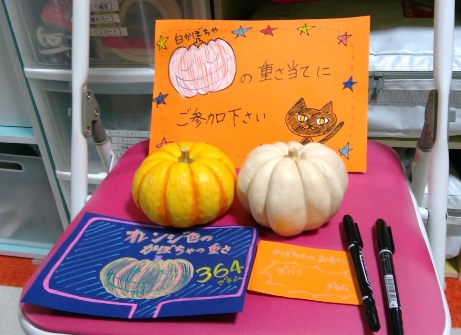 ハロウィン会までには、カボチャの重さあてゲームを保護者様・おじいちゃんおばあちゃんにも参加していただきました。ピタリ賞はありませんでしたが、1グラム違いのニアピン賞が出ました!!!当日までわからないドキドキを楽しんでいただきました。