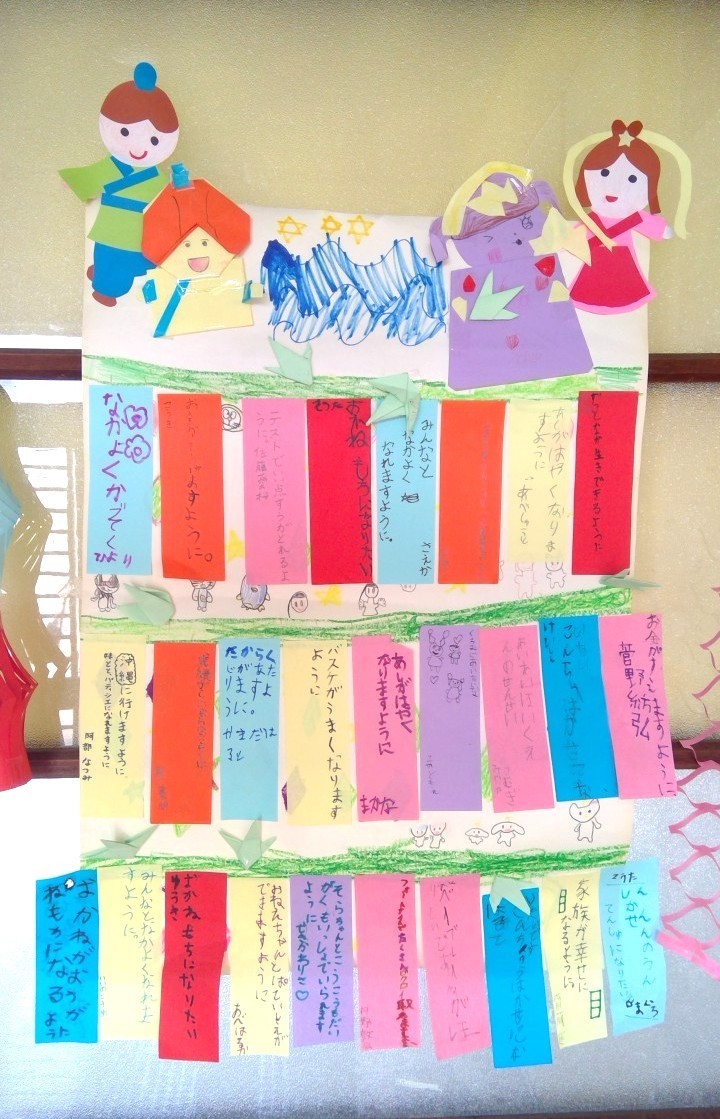 七夕のストーリーについて知っている児童たちに、初級・中級・上級のクイズをしたり、短冊にお願い事を書いたり、みんなでおやつを食べたり、楽しい時間を過ごしました。