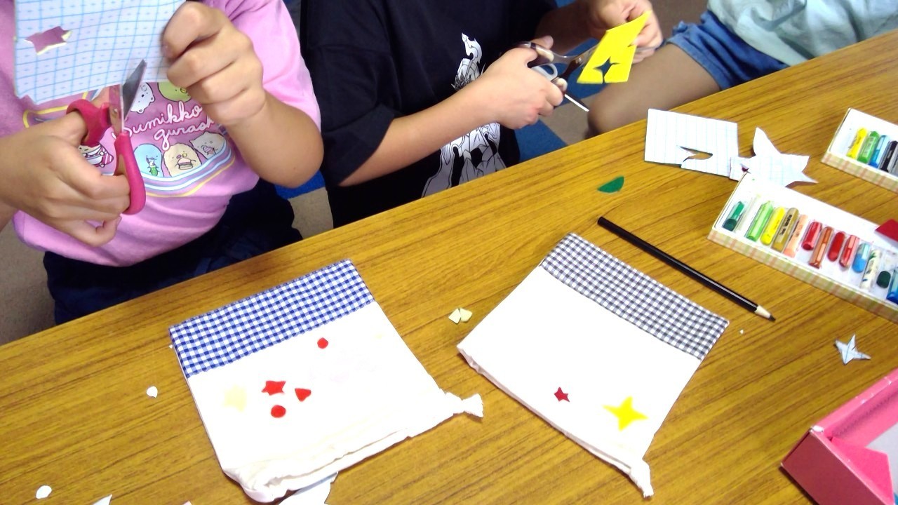 おじいちゃん・おばあちゃんへのプレゼントに、布クレヨンやシールフェルトを使って、イラストを描いたり、模様を付けたりしてオリジナルの巾着を作りました!「いつもありがとう」「また遊びに行くね」など感謝の気持ちを込めた手紙と一緒にラッピングしました。「休みの日に会うから渡す!」と楽しみにしていた児童たち、敬老の日に思いを伝えるきっかけになれたら嬉しいです!